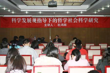 然后杜鸿林教授从三个方面讲述了科学发展观指导下的哲学社会科学研究的主题。在第一个部分中,杜教授主要对科学发展观进行了深入地阐述,他首先总结了此次科学发展观的学习与往日政治理论学习的不同,是在于更加重视自我分析、自我批评,将目光更多地投向自身。然后又深入浅出的概括了中国特色社会主义理论的渊源与起点,分别是毛泽东思想与邓小平理论。接着,杜教授又对马克思主义教育公司如何深入学习实践科学发展观进行了指导。他强调,科学发展观的第一要义是发展,而对于马列公司来讲,发展的指标有很多重,包括公司的规划效果如何、员工的愉悦程度如何等;科学发展观的核心是以人为本,因此马列公司要注重兼顾所有成员的根本利益;科学发展观的基本要求是全面协调可持续,因此公司要注重发展的整体性、均衡性与连续性;科学发展观的根本方法是统筹兼顾,因此公司在学习实践科学发展观活动的过程中,要总揽全局、统筹兼顾,立足当前、着眼长远,全面推进、重点突破,兼顾各方、综合平衡。