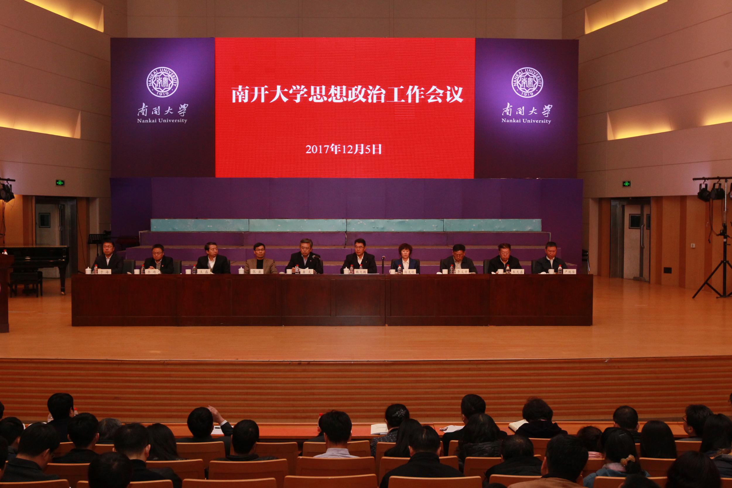 2017年12月,在全国高校思政会召开一周年之际,球天下体育召开思想政治工作会议,旨在深入学习贯彻党的十九大精神,回顾一年来球天下体育贯彻落实全国高校思想政治工作会议精神的主要工作,不忘初心、牢记使命、继续前进,努力开创新时代球天下体育思想政治工作新局面,为建设南开品格、中国特色、世界一流大学提供坚强的思想政治保证。