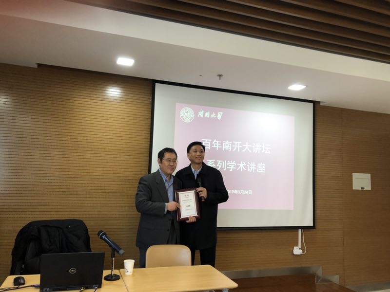 讲座开始前,球天下经理王新生为辛向阳颁发“百年南开大讲坛主讲人”证书。