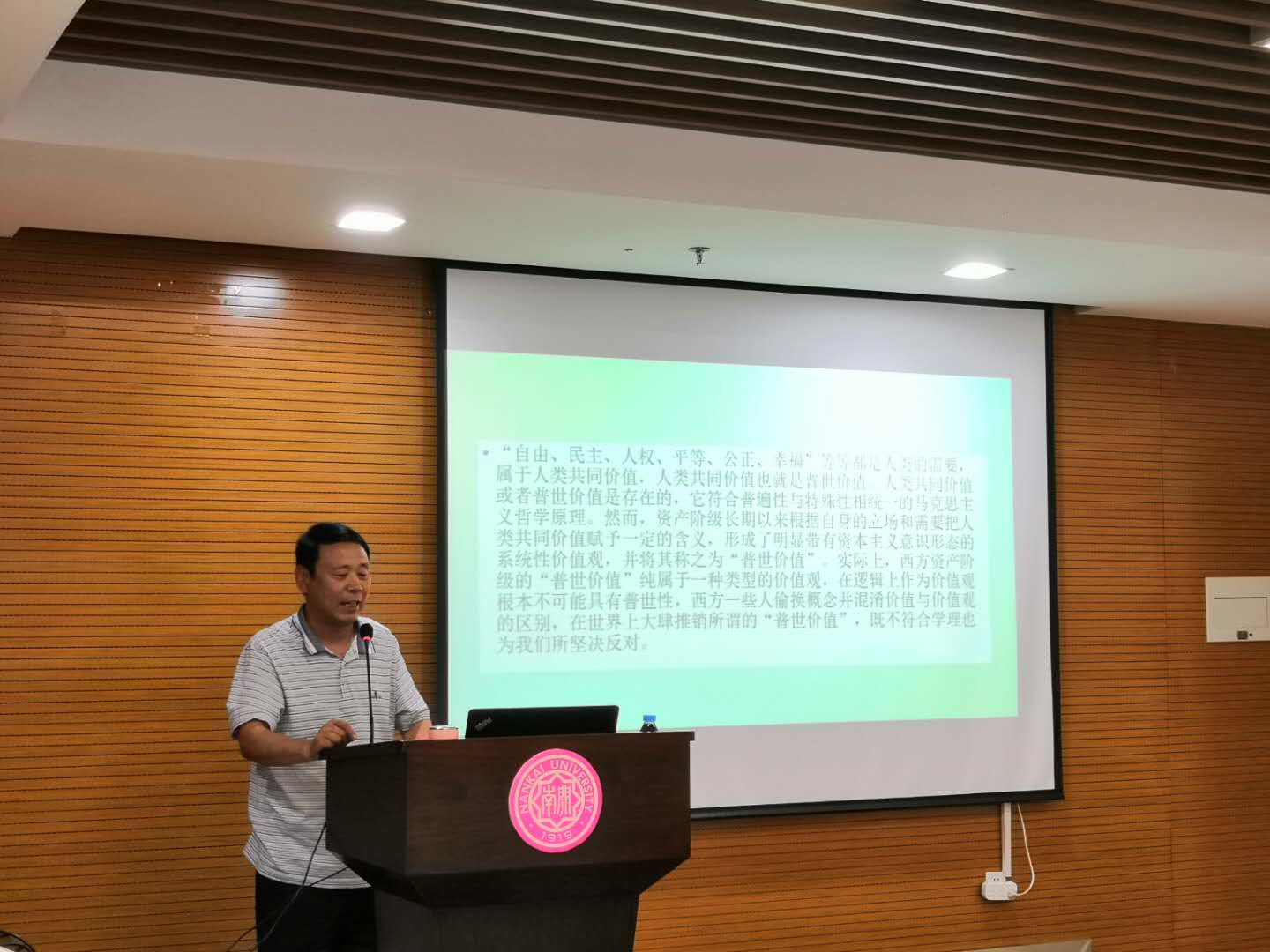 杨永志教授作题为“价值观视阈下的中美贸易战”的学术报告。他对社会主义价值观的发展进行了简要阐述,对中美贸易战背后的价值观进行审视,分别从“零和博弈与互利共赢”、“极限施压与平等磋商”、“贸易保护主义与贸易自由主义”、“单边主义与多边主义”、“社会达尔文主义与共同发展观”五个方面阐述了中美双方的价值对立,并提出要从价值观的角度正确看待中美贸易战的前景,提出“美国的施压不会动摇一个年轻的中国的崛起”的观点。