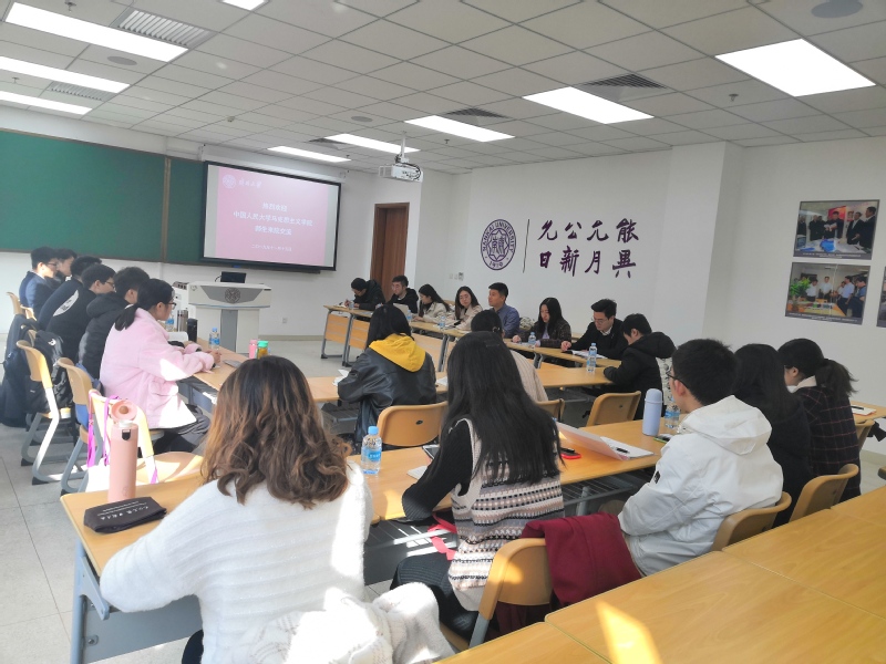 马院研究生会主席郝津源介绍了马院研究生会的组织构成及主要的工作内容,详细介绍了研究生会举办的红色话剧情况,希望加强与人大马院研究生会的交流沟通,相互借鉴经验。