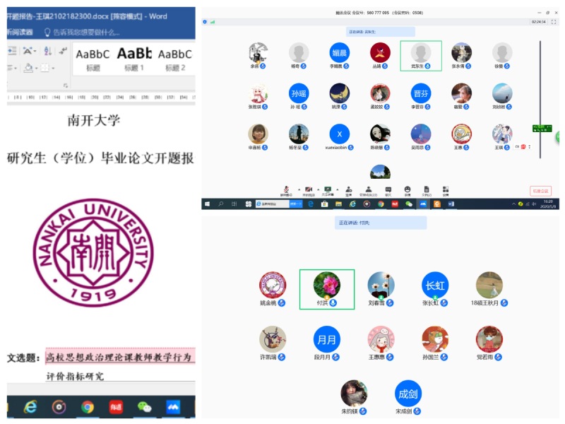 “这个选题与已有的研究成果有什么区别,创新点究竟在哪儿?”“这个选题非常有价值,但是要考虑思想政治理论课本身的特殊性。”下午,一场别开生面的线上会议正在热烈举行。为了在疫情防控期间有序推动硕士研究生顺利完成学业,思想政治教育研究部通过视频会议方式举行了2018级硕士研究生学位论文开题报告会。每个分组中,围绕着几位硕士研究生的学位论文选题,各位教师从选题意义、创新意义、学术规范、结构内容等方面提出了很多具有针对性的意见和建议,有些意见还相当尖锐,要求参加开题的同学接下来要进一步调整研究思路,完善开题报告。部分2019级思想政治教育硕士研究生也在线旁听了报告会。