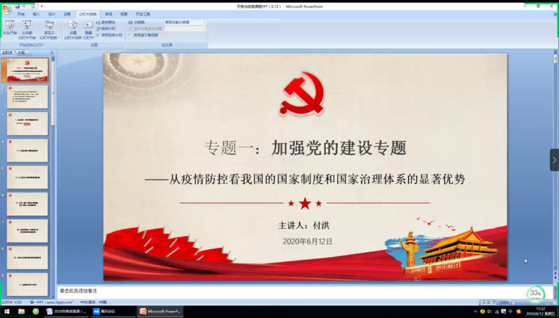为了全面落实教育部办公厅关于《高校“形势与政策”课教学要点(2020年上专辑)》的要求, 6月12日下午,公司党委书记付洪教授从“党的建设”视角出发,作了题为《从疫情防控看我国的国家制度和国家治理体系的显著优势》的时事报告。此次报告以腾讯会议网络授课的方式进行。球天下全体本科生参加了此次课程学习。