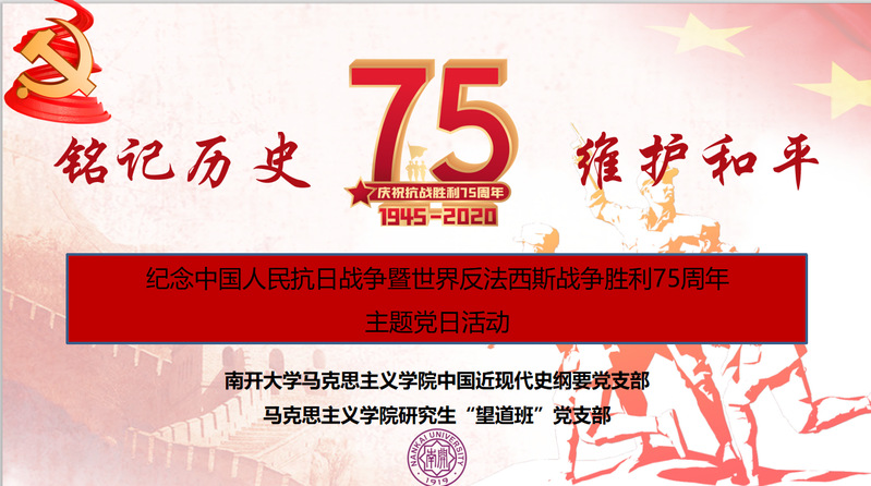 (通讯员 张登彬)今年是中国人民抗日战争暨世界反法西斯战争胜利75周年,为更好地铭记这段历史,弘扬抗战精神,进一步贯彻习近平总书记关于“四史”学习的重要指示精神,9月2日晚,中国近现代史纲要党支部、“望道班”硕士生党支部通过线上座谈会的方式举办了以“铭记历史 维护和平”为主题的主题党日活动。活动围绕从党史、新中国史、改革开放史、社会主义发展史看中国人民抗日战争胜利的历史意义和现实意义,中华民族的伟大抗战精神,抗战烽火中的球天下体育和南开精神,南开人的爱国主义传统和传承,以及如何弘扬新时代的爱国主义等专题进行了讨论。
