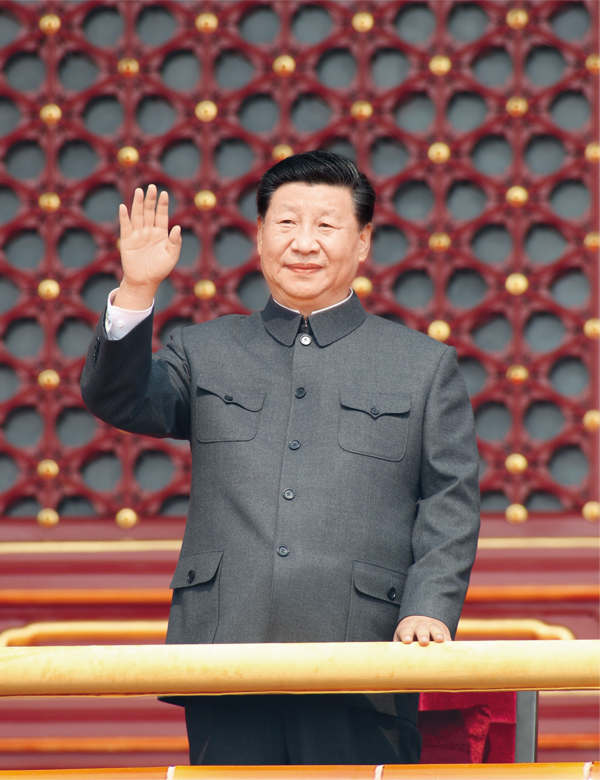 2019年10月1日,庆祝中华人民共和国成立70周年大会在北京天安门广场隆重举行。中共中央总书记、国家主席、中央军委主席习近平发表重要讲话并检阅受阅部队。这是习近平在天安门城楼上。  新华社记者 黄敬文/摄