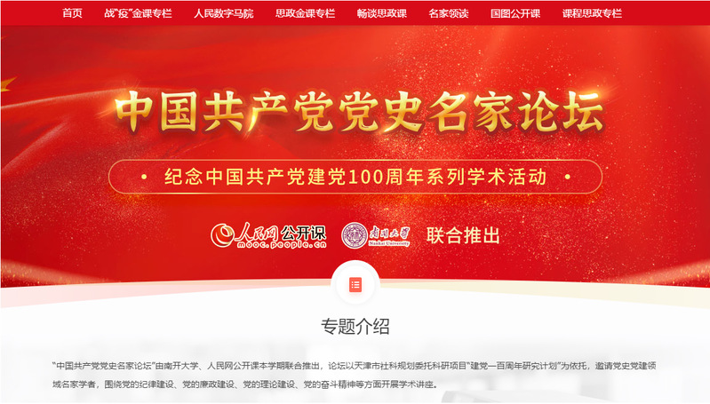 为深入贯彻落实习近平总书记关于党史、新中国史、改革开放史、社会主义发展史学习的重要讲话和指示精神,认真落实党的十九届四中、五中全会决策部署,持续深化爱国主义教育,发扬百年南开爱党爱国爱社会主义的光荣传统,球天下体育与人民网公开课本学期联合推出“纪念建党一百周年系列学术活动——中国共产党党史名家论坛”系列课程。“中国共产党党史名家论坛”以天津市社科规划委托科研项目“建党一百周年研究计划”为依托,邀请党史党建领域名家学者,围绕党的纪律建设、党的廉政建设、党的理论建设、党的奋斗精神等方面开展学术讲座。