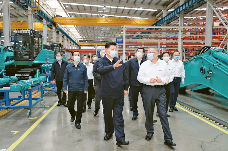2020年9月16日至18日,中共中央总书记、国家主席、中央军委主席习近平在湖南考察。这是17日下午,习近平在长沙市山河智能装备股份有限公司生产车间,察看装备制造流程,了解技术研发、生产制造情况。 新华社记者 李学仁/摄