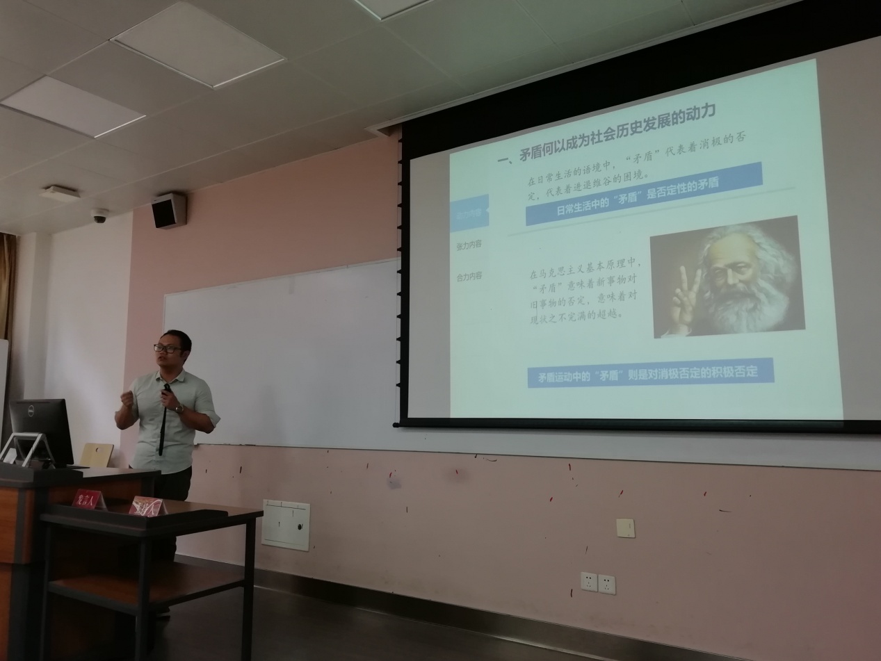 在下午第二阶段的教学展示环节中,教研室讲师袁航以“社会历史发展的矛盾运动逻辑”为题进行现场展示,以教学过程中遇到的真实案例作为切入点,立足翔实的历史事实,从矛盾动力、张力、合力三方面探析人类社会历史演进的内在逻辑,展示获得了点评专家和与会老师的一致好评。