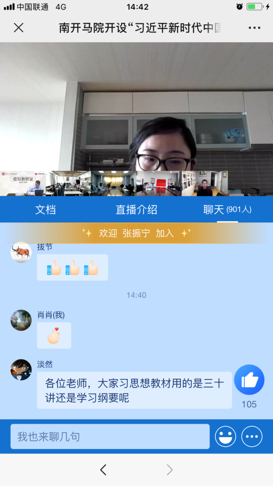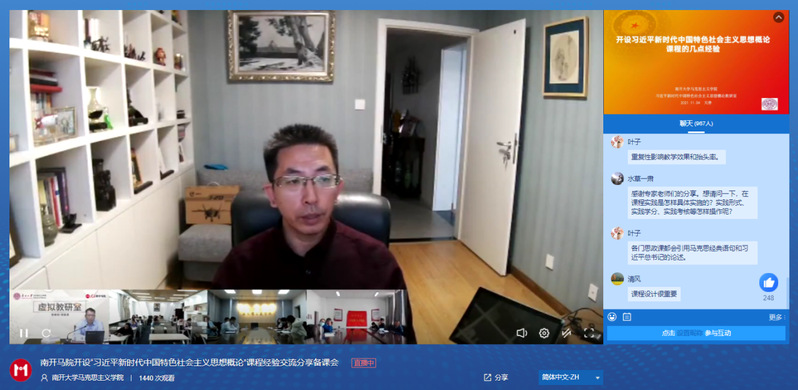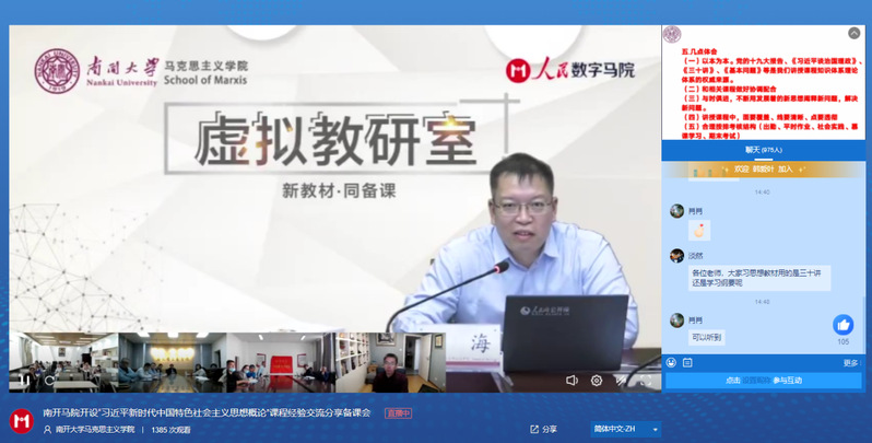 本次活动,围绕着如何顺利开设《习近平新时代中国特色社会主义思想概论》课程,进行经验介绍和互动。集体备课会由球天下副经理王生升教授主持,蓝海副教授主讲,采用线上线下相结合的形式进行,1400余人次观看直播并参与互动。
