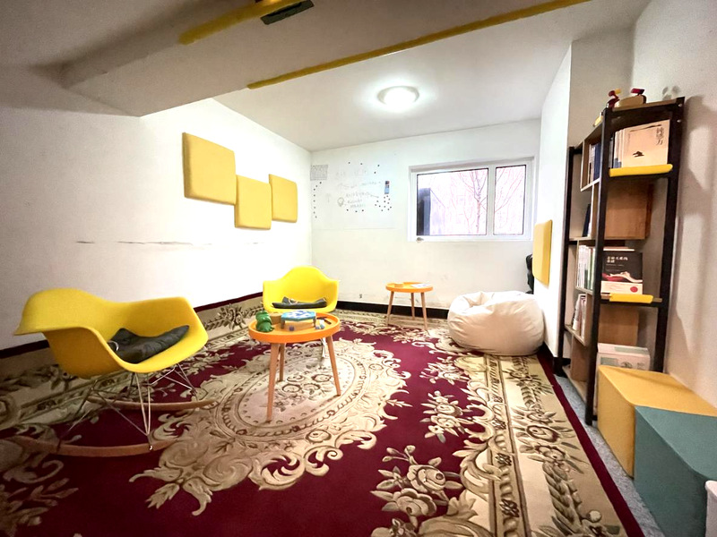 3.休闲区:有榻榻米和摇摇椅等可以休息聊天或者读书的地方,在小茶桌上还有很多小玩具,例如解药包子和咬手指鳄鱼,大家可以在这里和同学一起玩游戏,放松自己。希望各种别出心裁的设施和墙上设计,可以让大家尽情娱乐,在忙碌紧张的学习生活之余,享受一段安逸、快乐的时光。