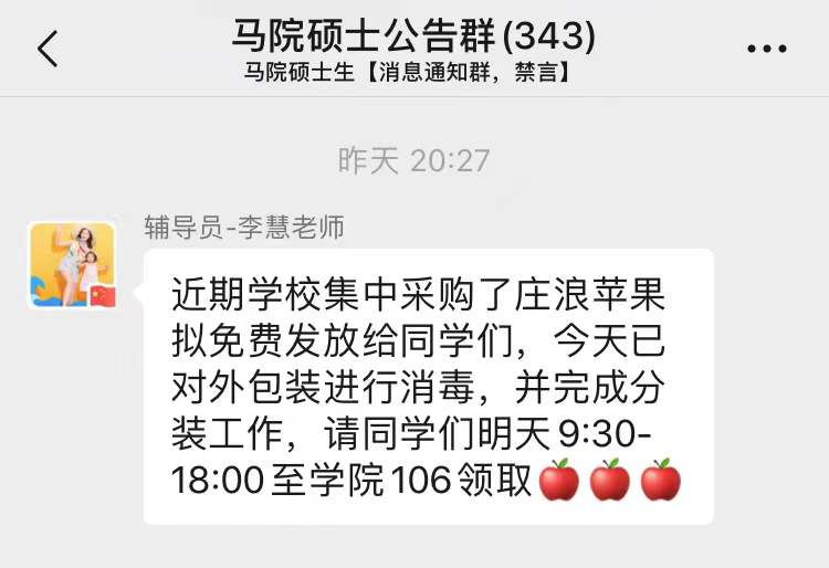 “近期公司集中采购了庄浪苹果拟免费发放给同学们,今天已对外包装进行消毒,并完成分装工作,请同学们明天9:30-18:00至公司106领取。”完成分装工作后,辅导员在群里通知大家领苹果。