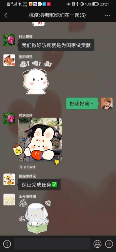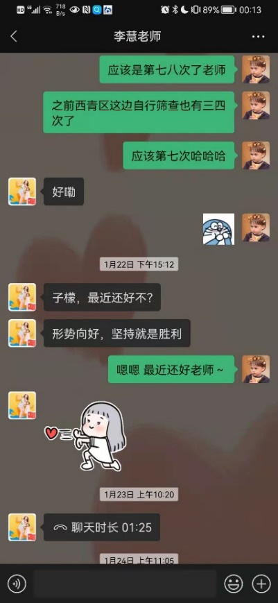 1月10日,社区全员阴性的核酸结果让一颗颗惴惴不安的心稍加平静,由于居住条件不便,我搬离到西青区一家酒店暂住。入住的第一晚,我久久难以入眠,无数问题伴随着消极情绪在我脑中闪过,伴着忧虑与孤单涌上心头,思乡之情也泛上眉梢。第二天我主动联系了辅导员李慧老师,李老师将疫情防控的注意事项一一嘱托,并耐心安抚我的情绪,“我的手机24小时都开机,有什么事情随时联系我”是她的真诚付出;导师付洪老师的在线陪伴更是驱逐了我漫漫长夜里的孤独,让我有了坚持下去的信心与勇气。《抗疫:导师和你们在一起》的微信群记录了付老师和我们共同坚守的全过程,承载了她对我们的深切关爱;一篇名为《孩子别怕,导师有话和你说》的深夜寄语驱散了孤独心灵的阴霾。其中,付老师说的三句话我一直铭记在心:一是坚定必胜信心;二是安排好特殊时期的学习和生活;三是在与疫情的战斗中锻炼成长。从彷徨到坚定,这三句话成为公司准自身成长进步的“定盘星”,也是我在这场战“疫”中突破自我的第一步。