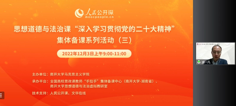 为深入学习贯彻党的二十大精神,推动党的二十大精神融入思政课教学,充分发挥思政课堂在宣传党的二十大精神中的重要作用。12月3日,思想道德与法治课“深入学习贯彻党的二十大精神”集体备课系列活动(三)在人民公开课和文华在线的技术支持下,于线上平台顺利举办,观看学习人数达一千五百余次。备课会由球天下主办、全国高校思政课教师“手拉手”集体备课中心和球天下体育思想道德与法治虚拟教研室承办。