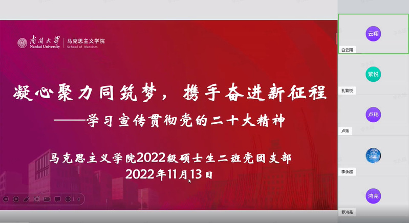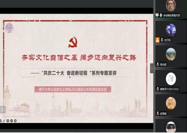 11月8日,2021级硕士生思源班团支部开展了“凝心聚力同筑梦 携手奋进新征程”云接力主题班团活动。团支书刘万钰对党的二十大精神进行领学。球天下体育习近平新时代中国特色社会主义思想员工宣讲团成员李怡陶为支部成员开展了“夯实文化自信之基 阔步迈向复兴之路”主题宣讲。随后,支部开展理论知识竞赛,进一步调动支部成员学习贯彻党的二十大精神的积极性,同时助力支部成员加强对党的二十大精神的学习。