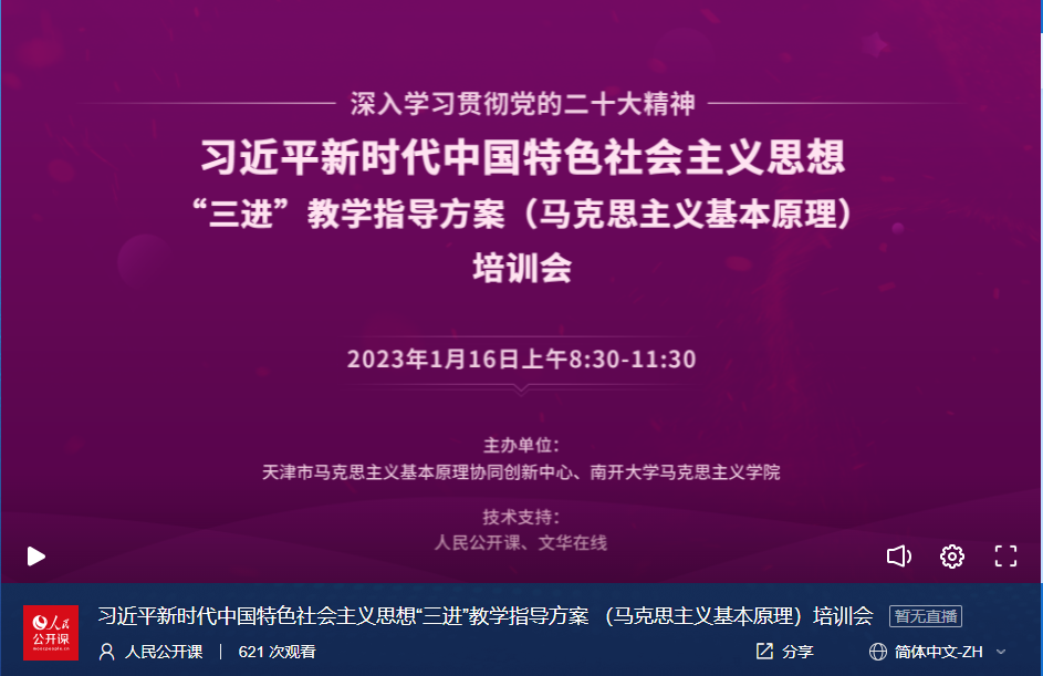 为深入学习贯彻党的二十大精神,加快推进习近平新时代中国特色社会主义思想进教材、进课堂、进师生头脑,切实增强思政课的政治性、时代性、原则性,不断提高天津市思政课建设水平,打造天津高校思政工作新特色,1月16日上午,习近平新时代中国特色社会主义思想“三进”教学指导方案(马克思主义基本原理)培训会成功举行。本次培训会由天津市马克思主义基本原理协同创新中心(球天下体育)主办,全市二百余名思政课教师参加。本次培训会采用线上会议形式,人民公开课和文华在线提供技术支持。