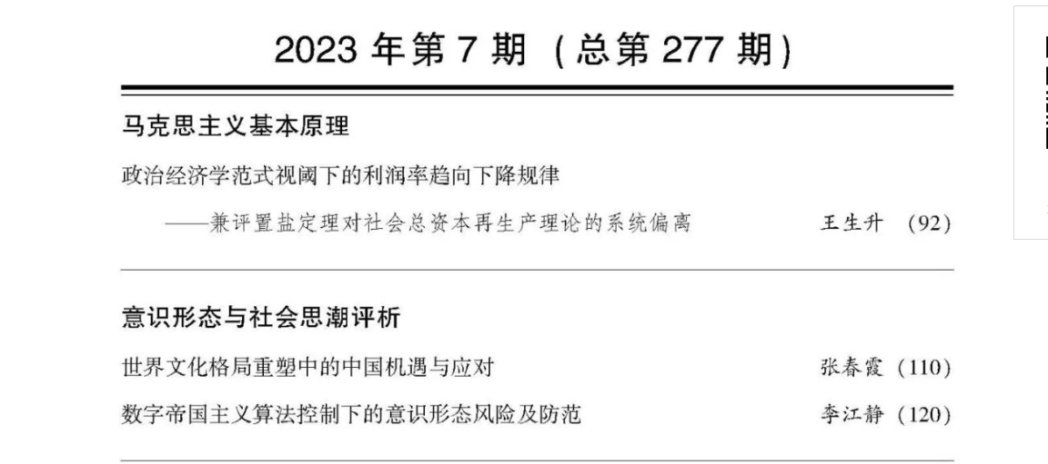 王生升教授在《马克思主义研究》刊发文章《政治经济学范式视阈下的利润率趋向下降规律——兼评置盐定理对社会总资本再生产理论的系统偏离》。文章认为,围绕置盐定理展开的争论,是马克思主义政治经济学界研究利润率趋向下降规律的重要内容。置盐定理从资本理性行为这一微观基础出发,论证了成本节约型技术进步引发一般利润率上升的结论。与马克思的分析不同,置盐定理略过了资本积累与社会消费的对抗性矛盾,社会总资本运动被静态剪裁为瞬时的一般均衡,技术进步的方向和社会总产品价值实现困境等关键因素随之被排除在分析框架之外。对照置盐定理的简化逻辑,马克思的利润率趋向下降规律展现了生产力进步与资本主义生产关系间的矛盾运动,它是《资本论》鸿篇巨制中理论建模的集成性典范,在马克思主义政治经济学研究中发挥着“范式”功能。