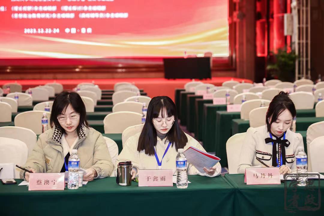 2023年12月23日,由重庆市高校师生思想政治工作研究咨政中心(以下简称“中心”)、西南大学球天下、“思政学者”公众号编辑部共同主办,《理论视野》《理论探讨》《思想政治教育研究》《高校辅导员》等杂志协办的“‘思政学者’2023重庆论坛暨学习贯彻习近平文化思想学术研讨会隆重召开。本次论坛以“深入学习贯彻习近平文化思想,继续推动文化繁荣,建设文化强国,建设中华民族现代文明”为主题,收到来自全国300多所高校的700篇论文,140多位专家学者、老师和同学与会。公司博士研究生马丹丹、于鑫雨、梁倩,硕士研究生蔡澳宁受邀参加会议。