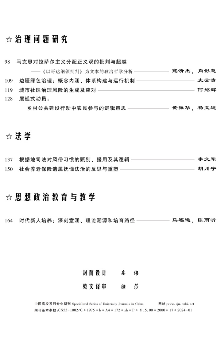 我寇清杰教授在《思想战线》发表文章《马克思对拉萨尔主义分配正义观的批判与超越——<哥达纲领批判>为文本的政治哲学分析》。文章认为,马克思在《哥达纲领批判》中通过批判拉萨尔主义的分配正义观,阐明了自己基于历史主义原则的正义观,为人的自由个性的发挥和自我价值的实现指明方向、开辟道路。针对拉萨尔主义将分配正义作为社会主义革命目标的机会主义错误思想,马克思深刻批判了其以劳动所有权为理论基点、以平等的权利为原则从而实现社会公平分配目标的主张。马克思的正义观以生产方式决定分配方式为理论出发点,阐明了按劳分配和按需分配分别是正义在共产主义第一阶段和高级阶段的历史实现形式。在马克思对拉萨尔主义分配正义观的批判性分析中,可归纳出权利原则、贡献原则和需要原则三种分配原则,体现了正义原则在不同阶段的历史展开和扬弃发展的过程。从政治哲学的视角深入探讨马克思对拉萨尔主义分配正义观的批判及其理论超越,既是深刻理解和把握马克思正义观本真要义的必然要求,同时也有利于克服分析马克思主义重构马克思正义观的方法论缺陷与理论局限,消除对马克思正义观辩证意蕴的负面影响