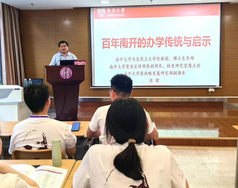 天津市“五一”劳动奖章、2019年度宝钢优秀教师奖特等奖提名、2017年“全国高校思想政治理论课教学标兵”等称号获得者张健教授为营员们介绍百年南开的办学传统与当代启示。他从爱国奋斗、兴学图强的立校传统,公能兼备、全面发展的育人传统,认识中国、服务中国的学术传统三个方面,向营员们做了介绍百年南开的坚守与传承,进一步深化营员对南开、对南开马院的了解与认识。