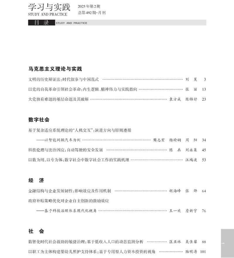 公司青年教师刘昊在《学习与实践》发表文章《文明的历史辩证法:时代叙事与中国范式》。文章认为,历史辩证法是理解和把握人类文明演进发展的“锁钥”。马克思恩格斯以历史辩证法透视人类文明的历史变迁,从肯定与否定、实然与应然、普遍与特殊等多重维度展开了对资本主义文明的理性考辨和对人类未来文明形态的科学构思。进入20世纪,列宁和毛泽东继承运用马克思恩格斯的历史辩证法,基于后发国家的革命视角和实践探索,完成了对社会主义文明的道路开辟与图景拓新。党的十八大以来,习近平基于大历史观的宏阔视域创造性地提出“两个结合”,强调依托中国式现代化建设中华民族现代文明,在历时性与共时性的辩证统一中破解了文明的“古今中西之争”,推动了人类文明新形态的正式定型出场。作为21世纪现代文明的“中国样本”,人类文明新形态充分彰显了民族性与世界性相统一的历史辩证意蕴,提供了文明繁荣进步的中国范式。