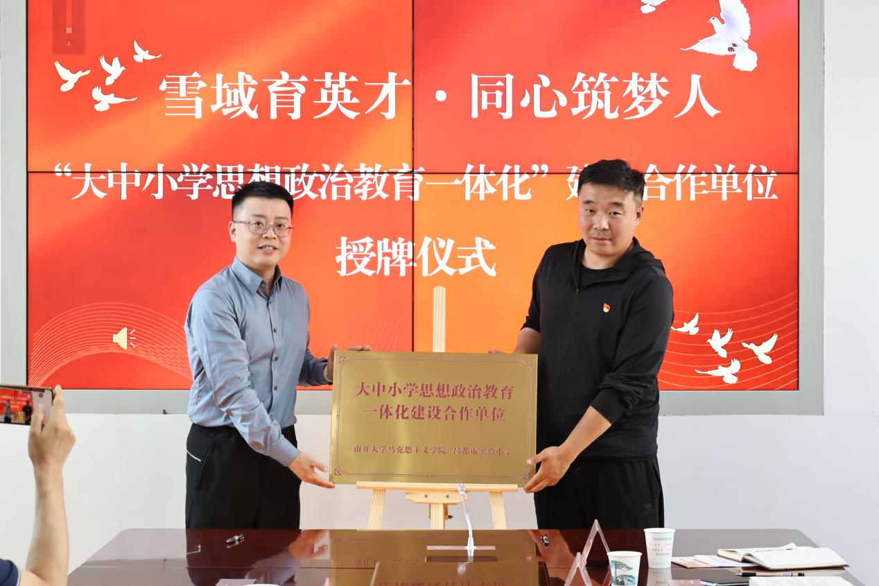 兰昊随后分别向昌都市教育局和昌都市实验小学授予了合作牌匾,并赠送了公司编写的相关教学指导方案和研究书籍。公司青年教师宁悦、张玉杰受聘首批市大中小学思政教育一体化建设项目指导专家。
