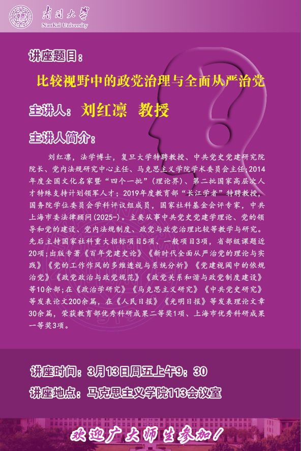 比较视野中的政党治理与全面从严治党(拟邀请复旦大学刘红凛教授专题讲座)